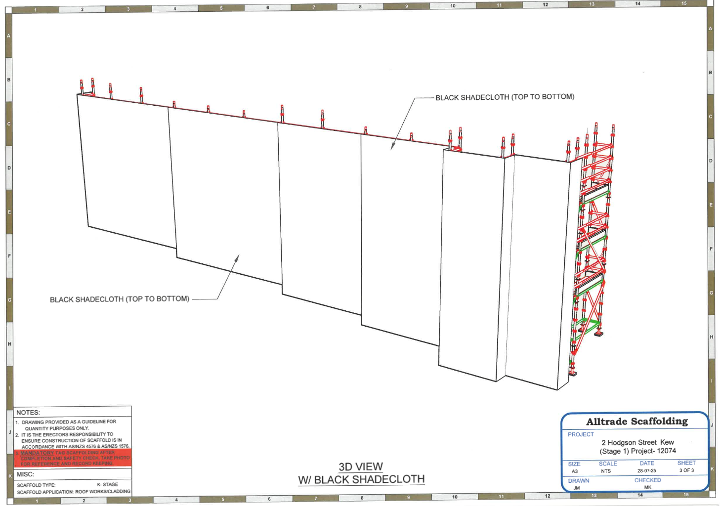 Alltrade Scaffolding was engaged to deliver safe, compliant, and efficient scaffold access to support roof and cladding works at a large residential property on Hodgson Street, Kew. With roof heights ranging from 6.7m to 8.3m, the solution required staged scaffold bays, integrated roof rails, and custom tie-ins, all designed to facilitate multiple trades while minimising site disruption.